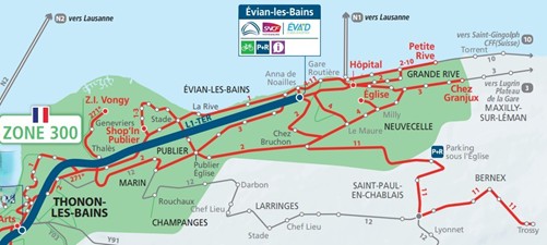 Définition de la Zone 300 (Pays d’Évian – Vallée d’Abondance) : Sur la carte du réseau, la zone verte représente la Zone 300. Les arrêts situés à la frontière sont indiqués en rouge.