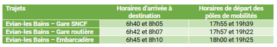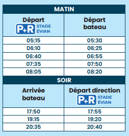 • Une expérimentation est en cours depuis le 7 juillet 2025 pour les actifs depuis le P+R Stade à Évian vers l’embarcadère avec horaires de départ garantis le matin et le soir. Attention, places limitées ! Téléchargez les informations ici.
